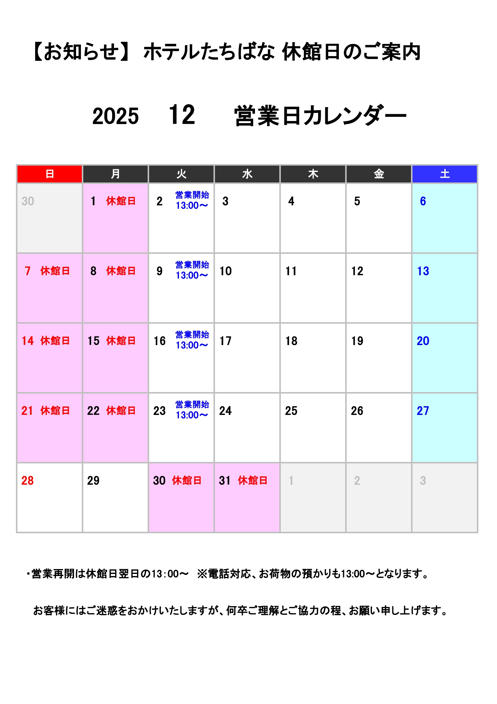 2025年12月 ホテルたちばな休業日案内_000001