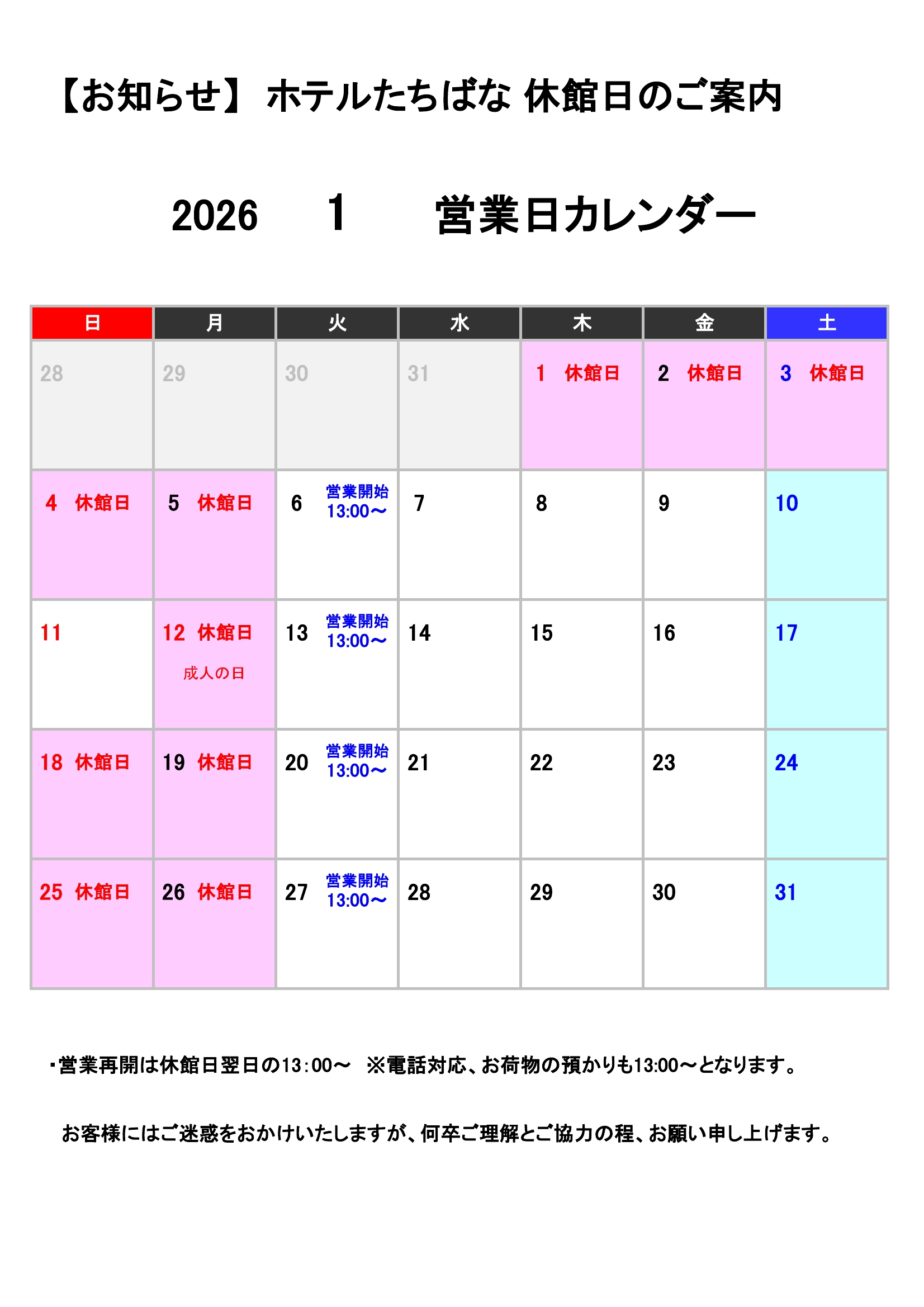 2026年1月 ホテルたちばな休業日案内_000001